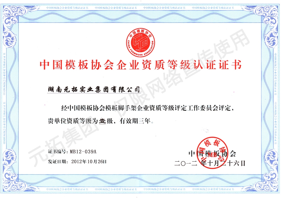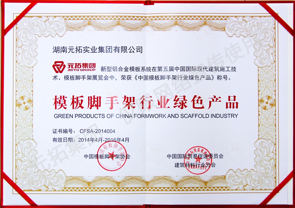 2011年,元拓集團被授予 “全國模板腳手架行業(yè)優(yōu)秀企業(yè)”;2012年,元拓集團榮獲模板腳手架企業(yè)一級資質(zhì)、元拓熱鍍鋅鋼跳板被評為“全國建筑物資租賃行業(yè)推介產(chǎn)品”;2013年,公司連續(xù)兩年榮獲阿里巴巴“風雨相伴獎”、“千萬網(wǎng)商獎”,并常年被授予“優(yōu)秀企業(yè)”、“先進單位”等榮譽。元拓腳手架,領(lǐng)袖型施工企業(yè)的選擇。 元拓就是家。